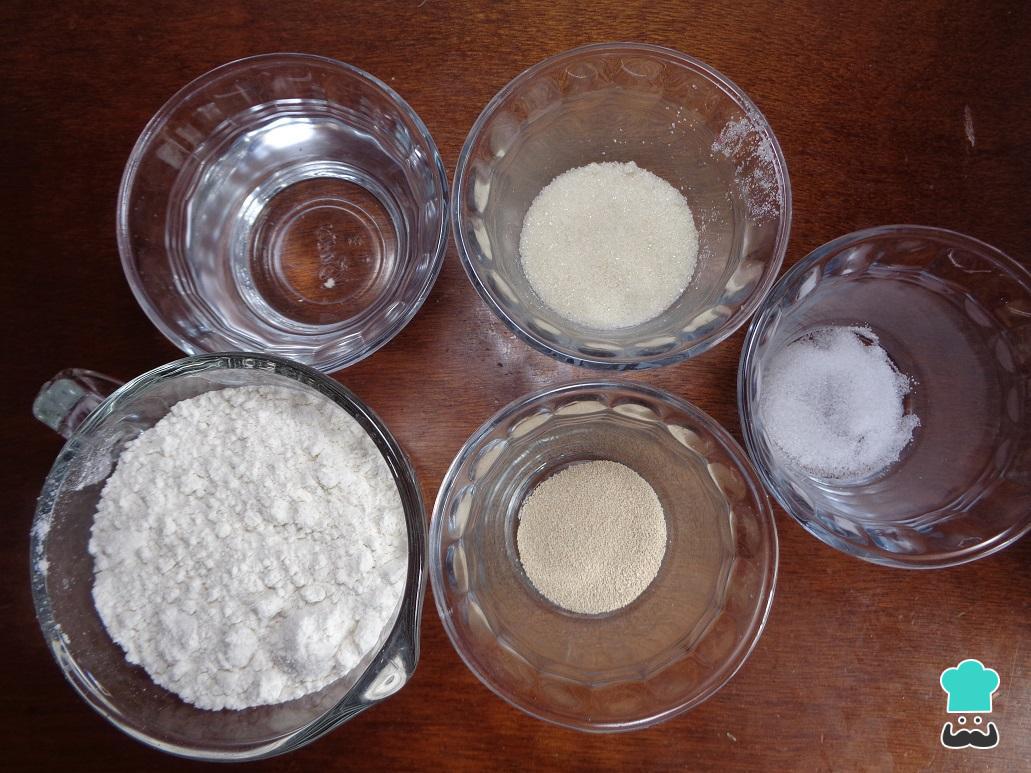 Você pode preparar esse pão numa bacia ou na bancada. Coloque nela a farinha e polvilhe o sal. Abra um buraquinho no meio da farinha e coloque aí a água com o açúcar e o fermento dissolvidos.