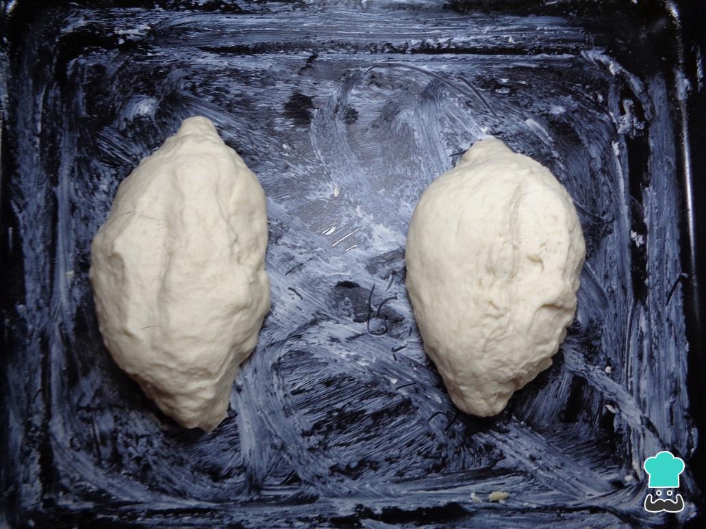 Após esse tempo volte a amassar a massa do pão, para retirar o ar. Separe em 4 ou 6 partes, modele em forma de pão francês e, com uma faca, faça um ligeiro corte na parte de cima. Coloque os pães em um tabuleiro de forno untado e deixe crescer por mais 30 minutos.