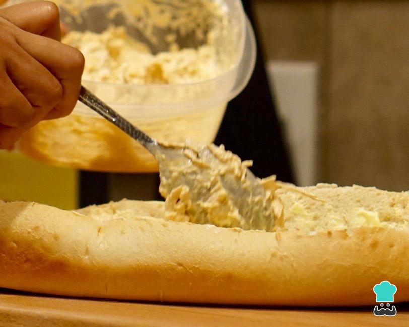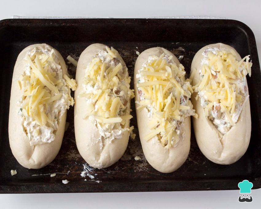 Corte a parte de cima dos pães e, cuidadosamente, retire o miolo sem furar o pão. Recheie cada um dos pães com a mistura anterior e polvilhe o queijo restante.