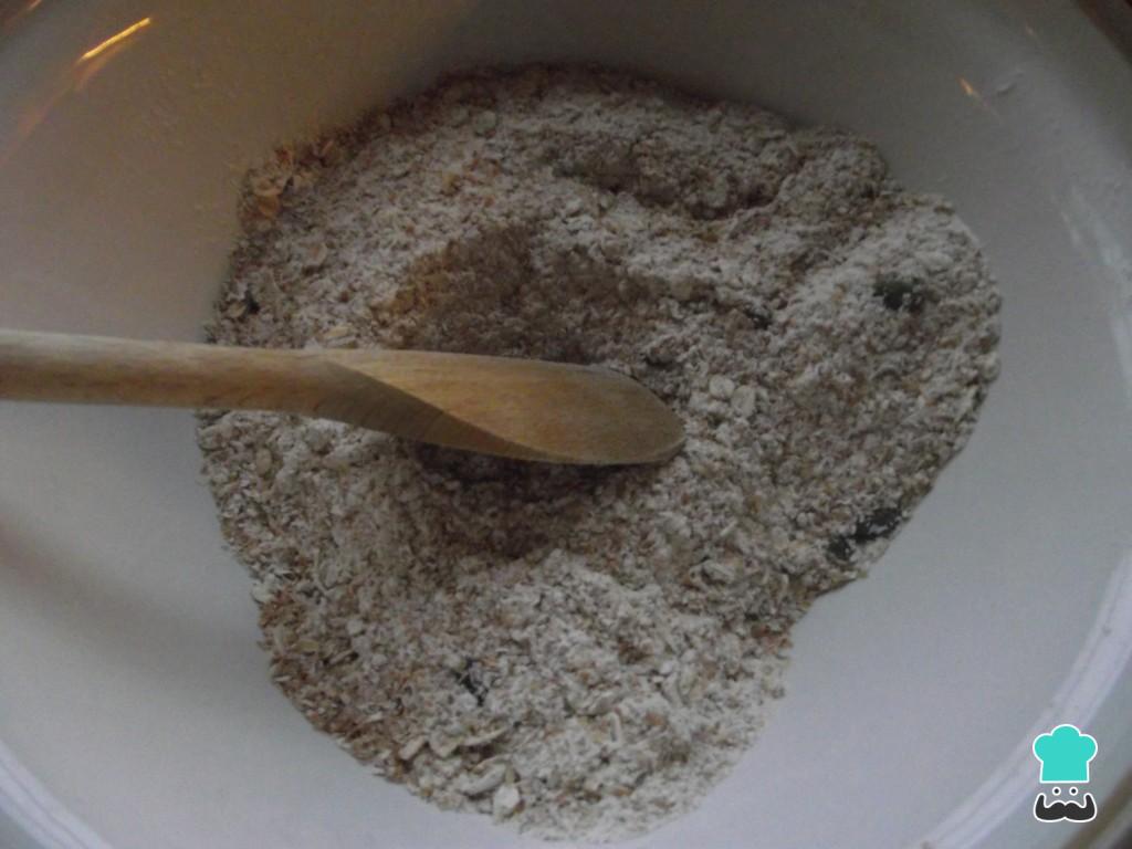 O primeiro passo desse pão caseiro e saudável é misturar os ingredientes secos em uma vasilha: 2 das xícaras de farinha de trigo, as restantes 3 farinhas, a mistura de flocos de aveia e sementes, o fermento desfeito em pedaços, o sal e o açúcar.