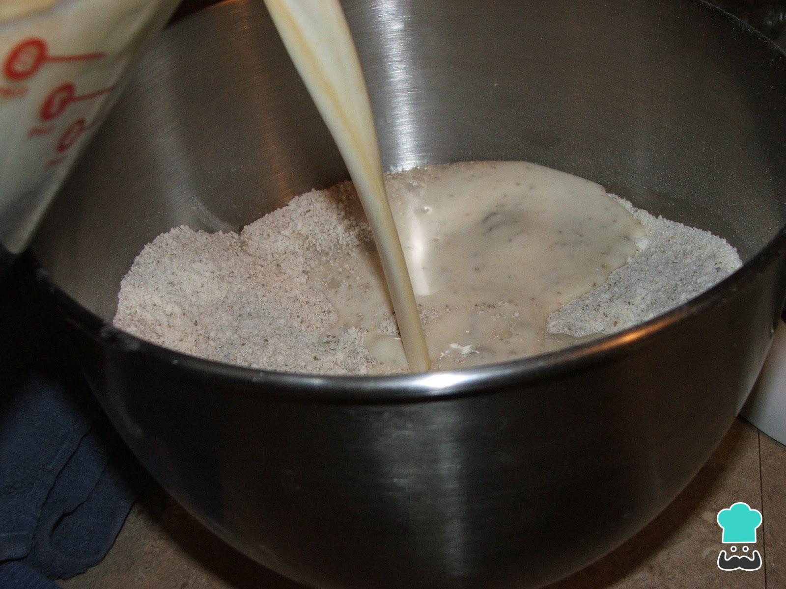 À parte misture ingredientes líquidos: a água, o leite, o ovo e o óleo. Abra uma cova ao centro dos ingredientes secos, coloque aí essa mistura dos líquidos e, em movimentos rotativos de dentro para fora, vá misturando tudo, usando a mão ou uma colher.