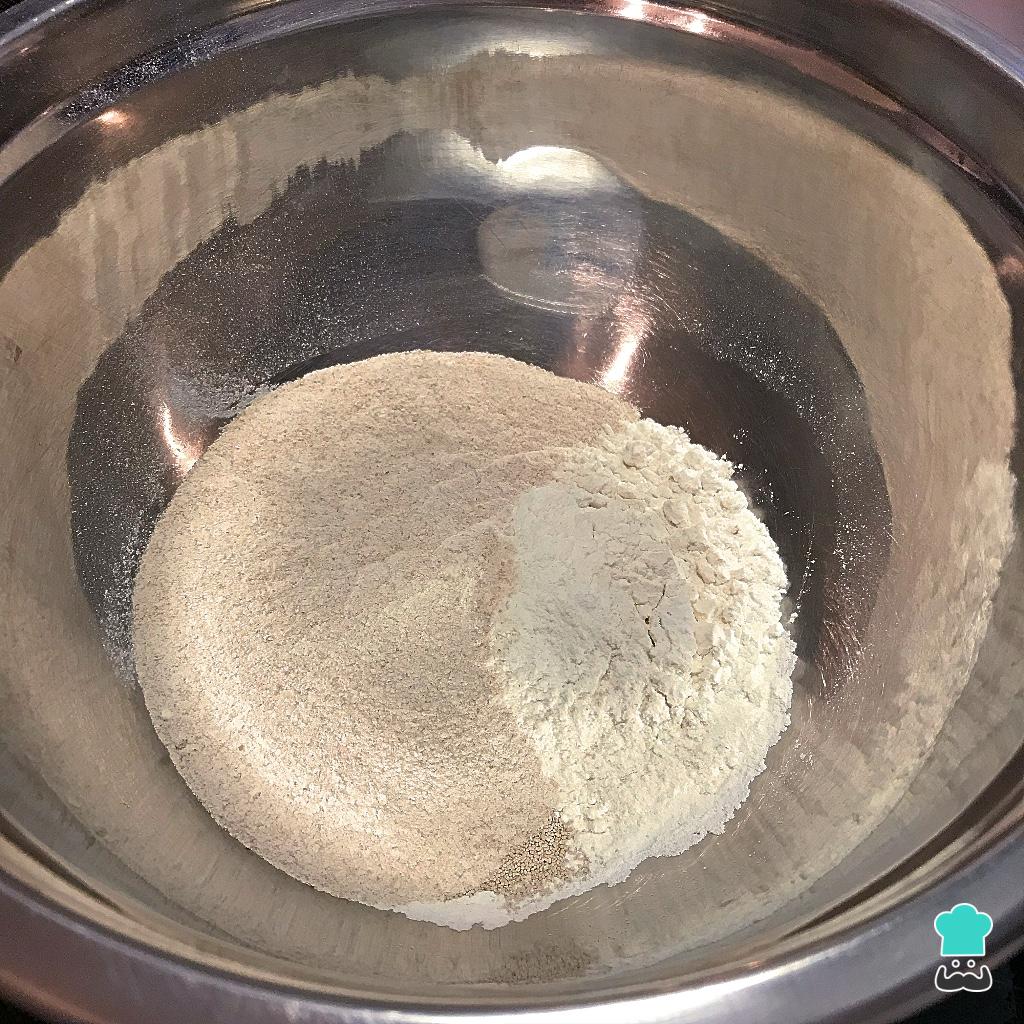 Misture todos os ingredientes secos (farinhas, sal e fermento).