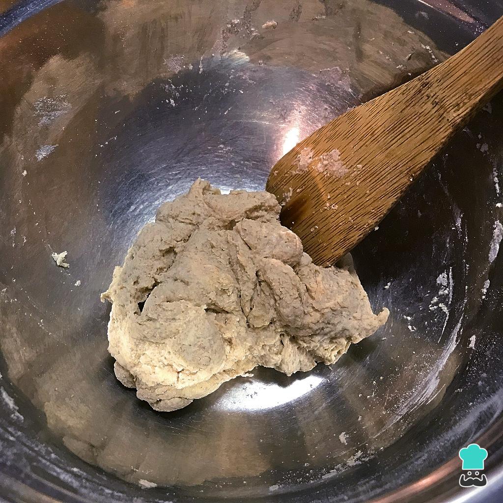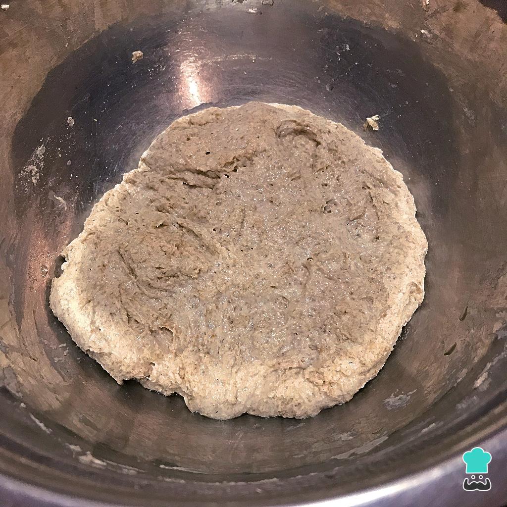 Adicione a água morna e mexa até que tudo esteja bem misturado. Cubra com um papel filme e um pano de prato por cima, leve para um local escuro e quentinho e deixe lá por 24 horas. Nesse momento pode parecer que é pouca massa, porém ela irá crescer bastante ao longo desse tempo.