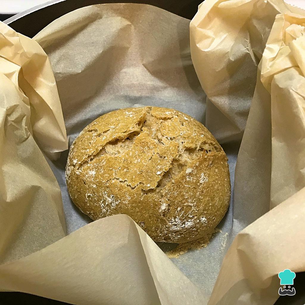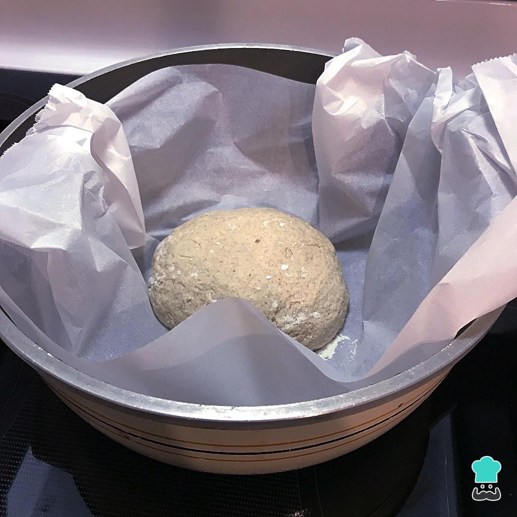 Assim que der 1 hora, coloque a massa do pão integral junto com o papel dentro da panela aquecida no forno. Tampe e volte para o forno por mais 25 minutos.