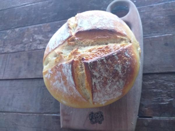 Retire a panela ou assadeira do forno e deixe esfriar um pouco. Está pronto seu pão levain! Ele fica bem gostoso, com casca firme e crocante. Experimente e conte para nos o que você achou!