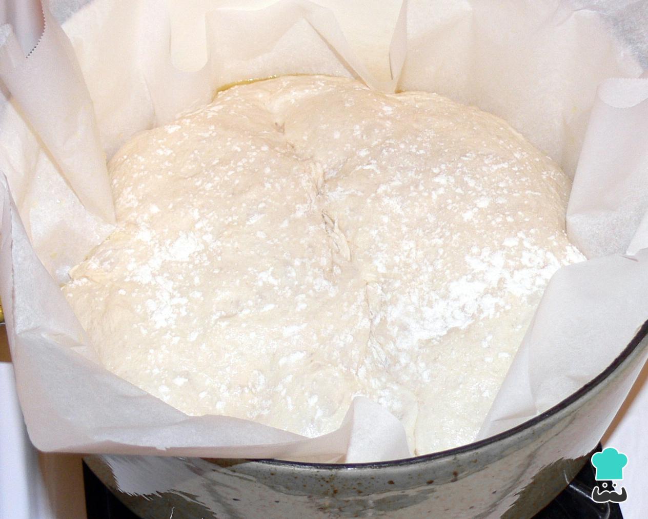 Depois desse tempo, pré-aqueça o forno nos 250ºC e coloque no interior uma panela que possa ir no forno ou uma assadeira redonda. Quando estiver bem quente, coloque dentro dela uma folha de papel manteiga e a massa do pão também. Faça um corte no topo do pão (em forma de cruz ou noutro formato da sua preferência).