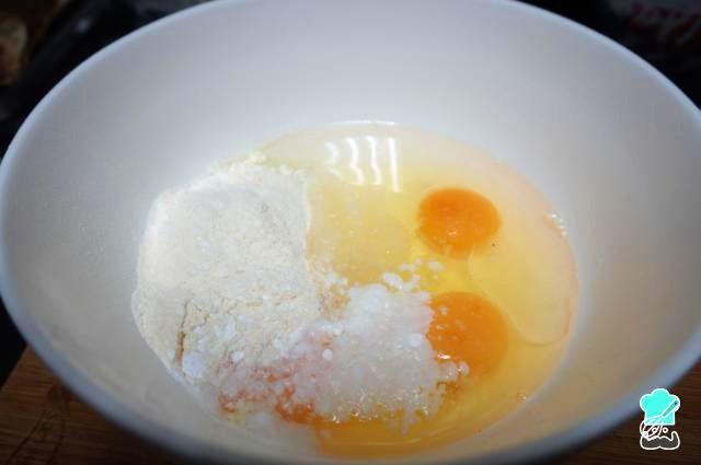 Em uma tigela, bata os ovos e acrescente a farinha de coco, e misture bem.