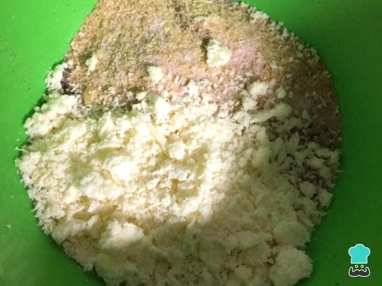 Comece por juntar em um recipiente os ingredientes secos desta receita de pão low carb fácil e rápido: as farinhas, o queijo e o sal.