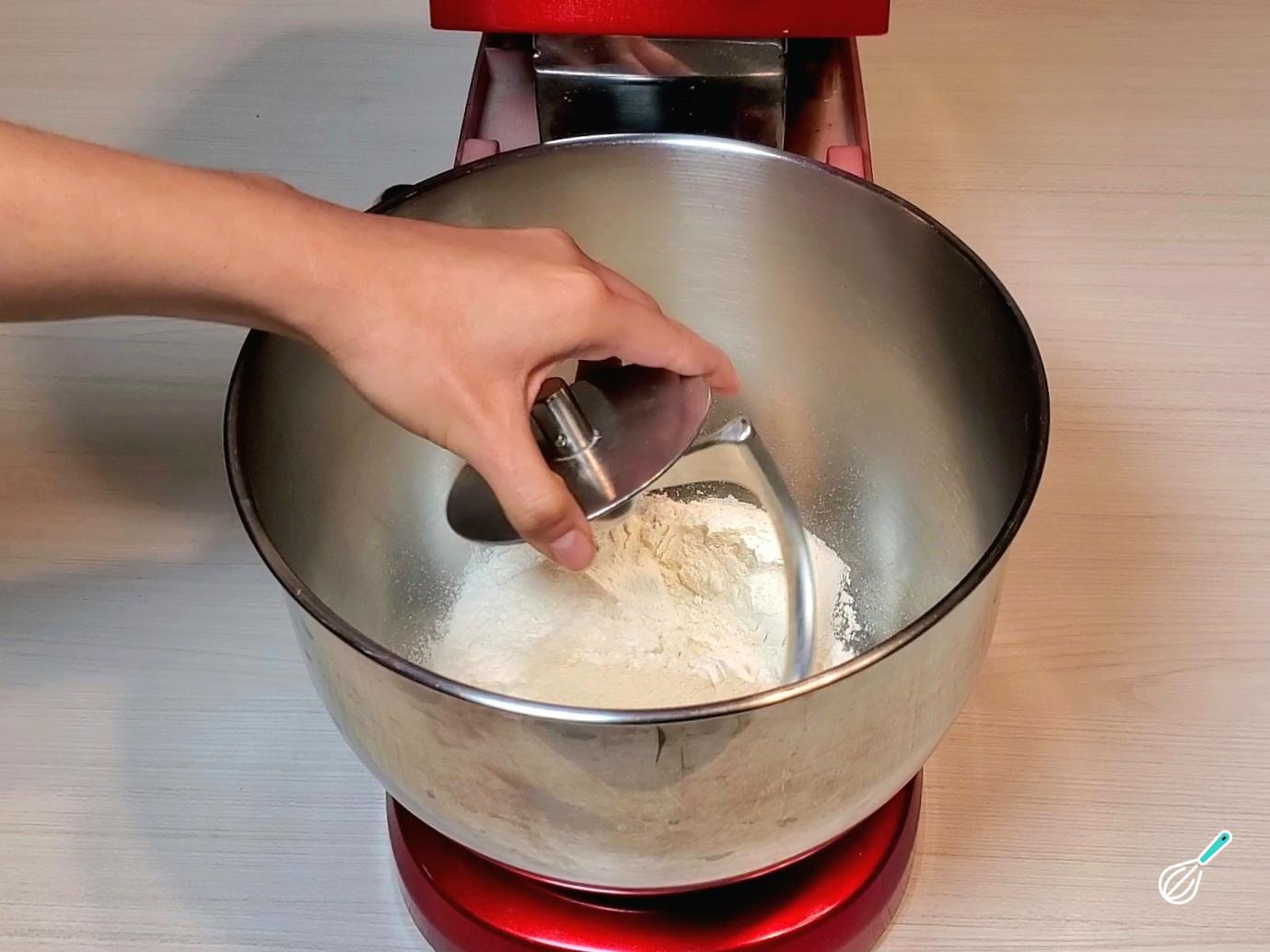 Comece colocando todos os ingredientes secos na tigela da batedeira: a farinha, o açúcar, o sal, o leite em pó e, por último, o fermento seco. Mexa bem usando o batedor em forma de gancho da batedeira.