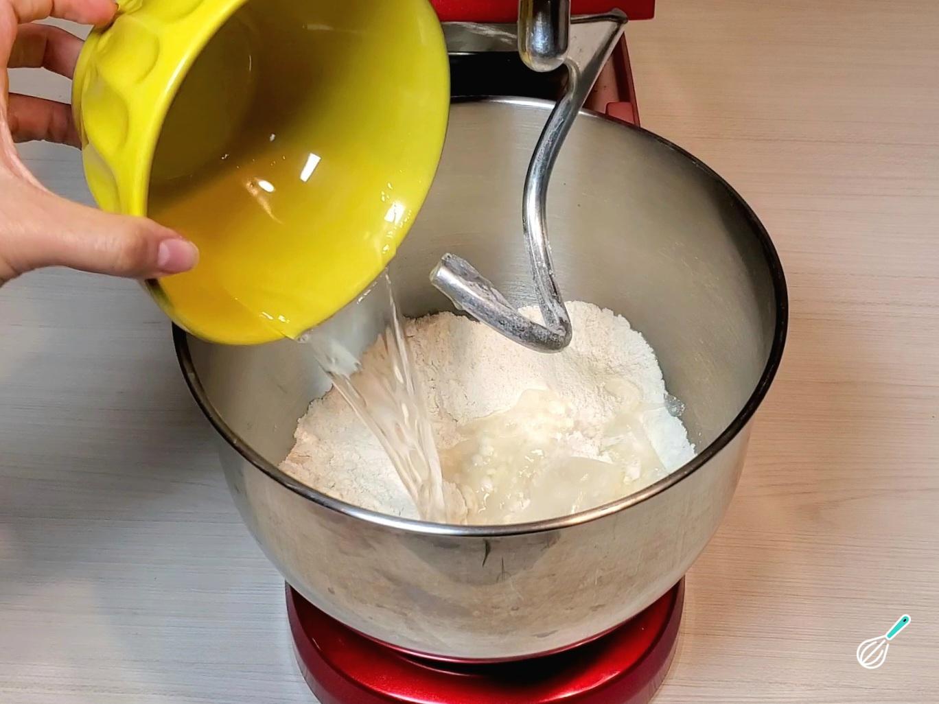 Adicione a água morna e ligue a batedeira na velocidade máxima para que todos os ingredientes se misturem bem.