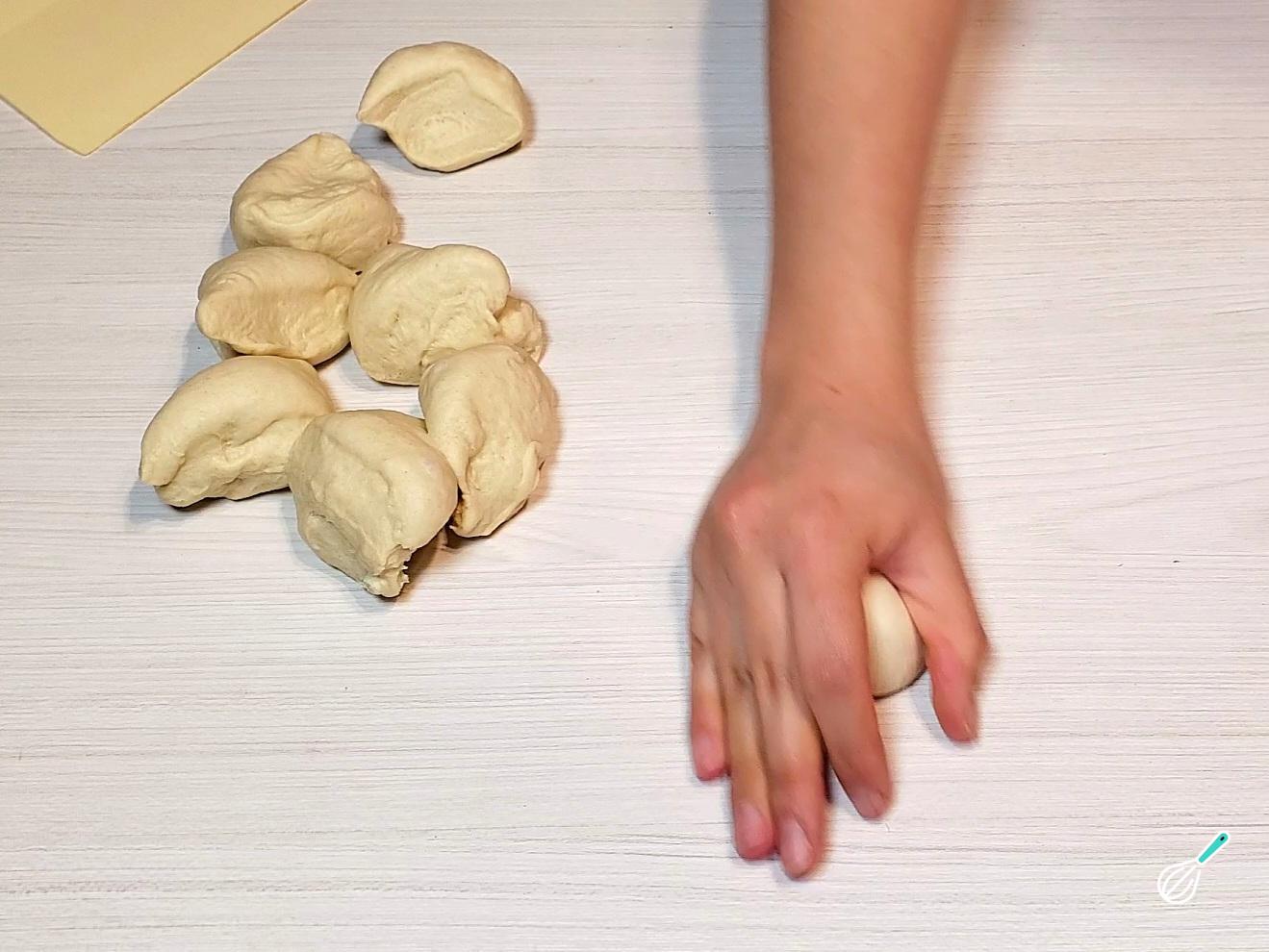 Após o tempo de repouso, retire a massa da batedeira e coloque-a sobre a mesa. Desinfle-a com as mãos, volte a enrolá-la e divida-a em pedaços de 60 gramas. Enrole cada um desses pedaços.