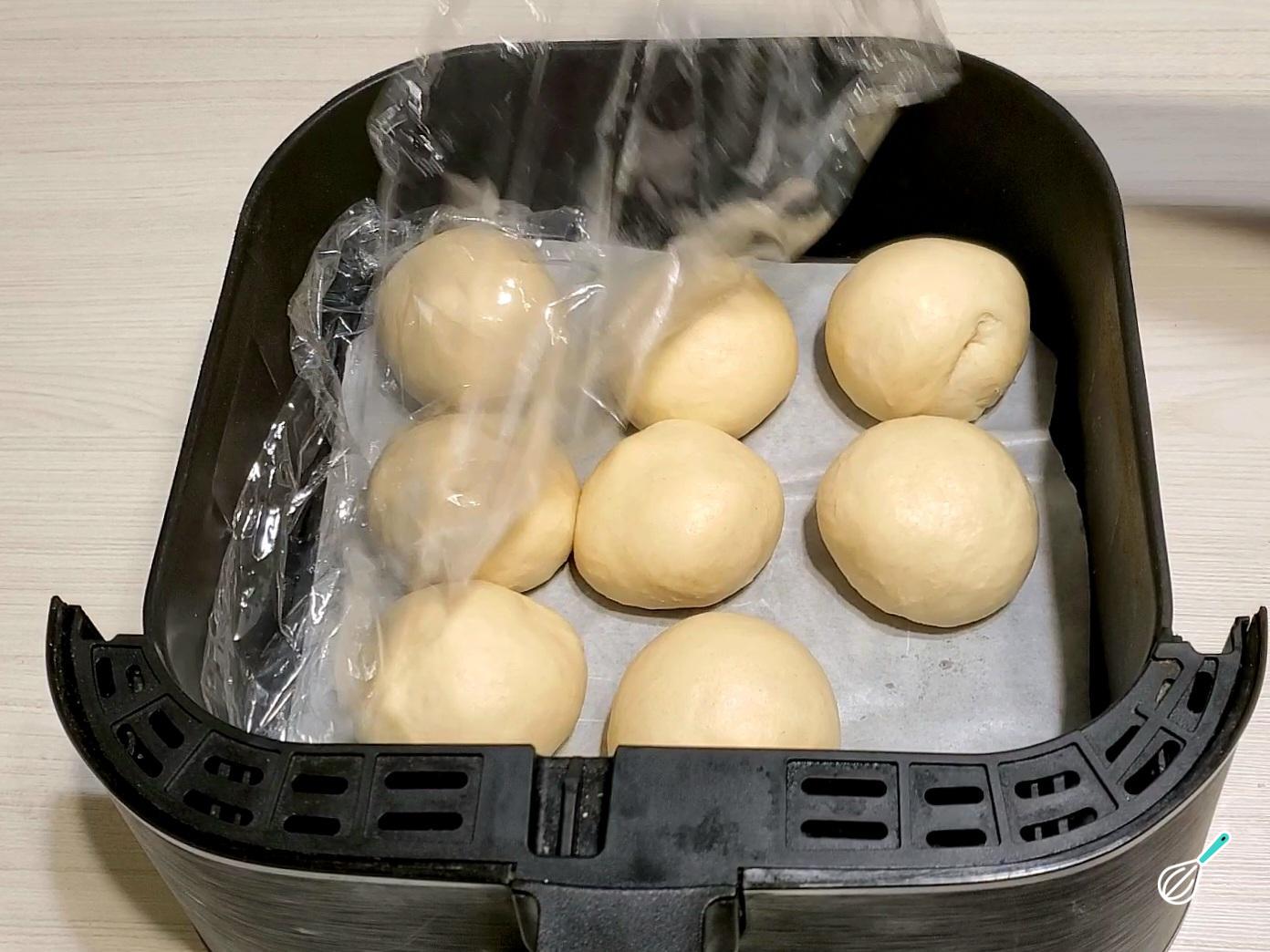 Coloque-as na cesta da air fryer; se preferir, coloque uma folha de papel manteiga na base. Cubra com filme plástico ou um pano úmido e deixe descansar novamente na área mais quente da sua casa até que dobrem de volume.