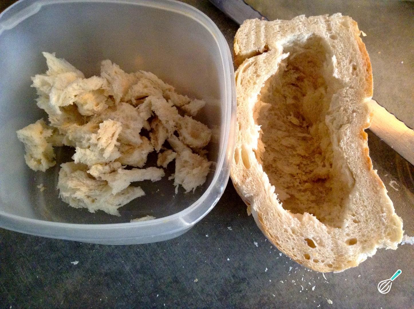 Comece por cortar o pão ao meio e retirar o miolo, de forma a que possa colocar o recheio dentro do pão. Tenha cuidado para não furar o pão, caso contrário o recheio irá escapar.