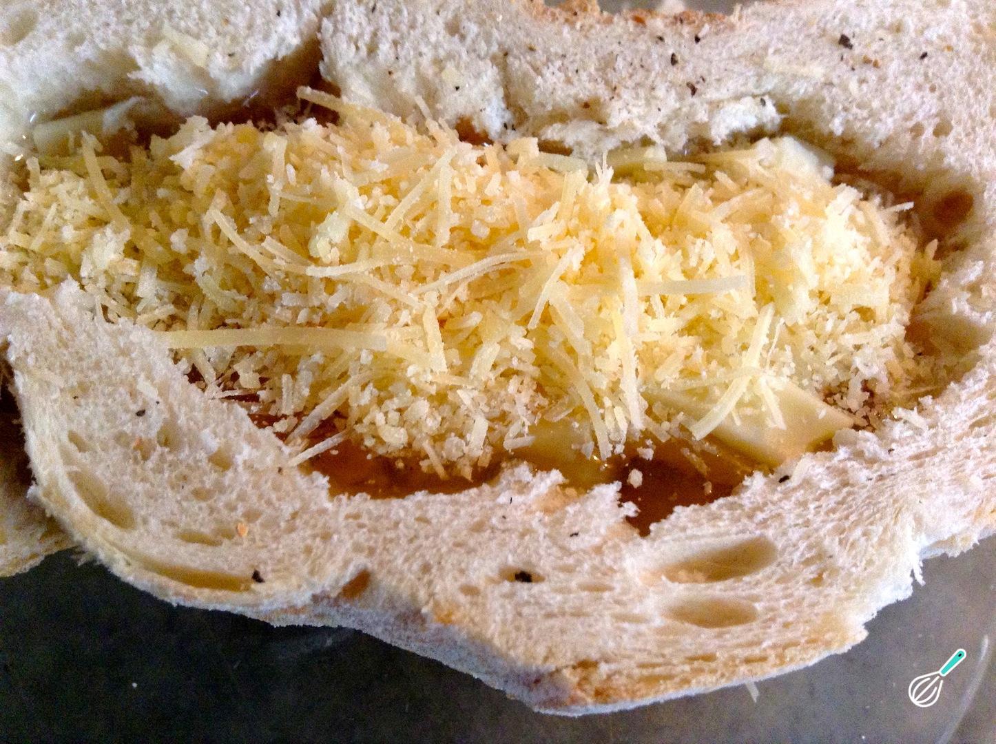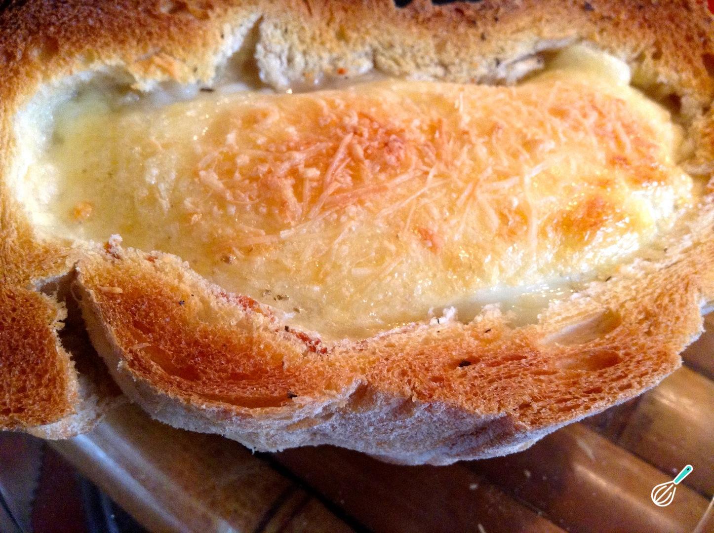 Quando retirar o pão recheado do forno ele deverá ter este aspeto de pão tostado e queijo gratinado.