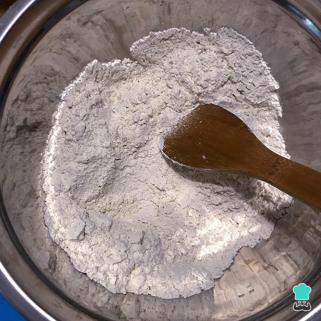 Misture todos os secos (a farinha sem glúten, o fermento, o sal e o açúcar).