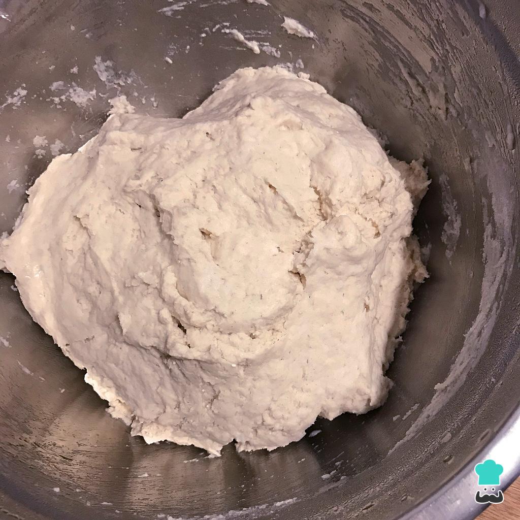 Adicione a água morna e mexa só até tudo estar misturado. Tampe e deixe crescer por 2 horas em um local quente. Passado esse tempo leve a massa para a geladeira e deixe descansar lá dentro por pelo menos 1 hora.