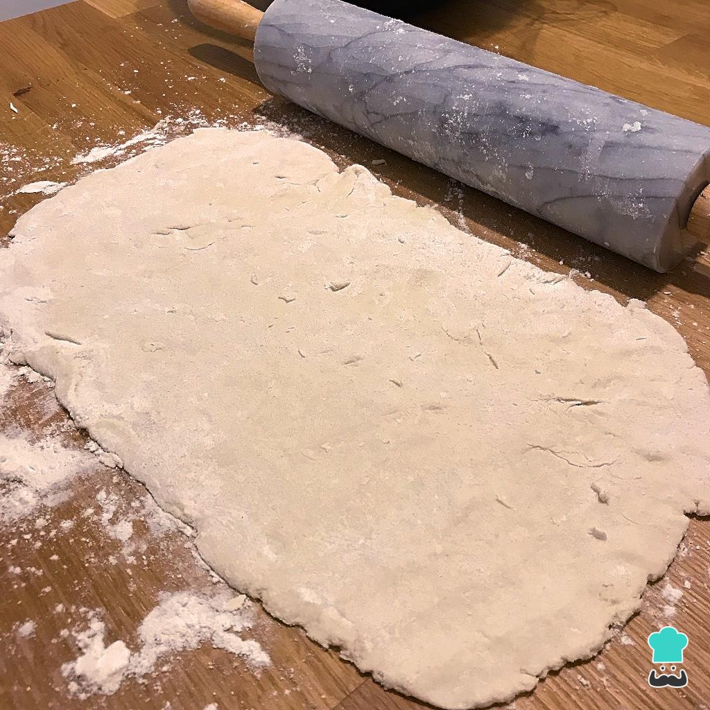 Abra a massa em formato retangular, com mais ou menos 0.5 cm de espessura. Polvilhe farinha para não grudar.