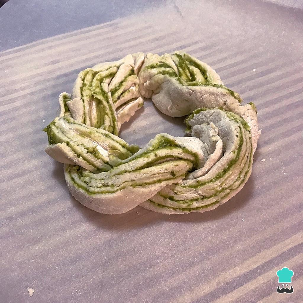 Esta trancinha mais linda e delícia vai impressionar seus convidados sem te dar muito trabalho, acredite! E para melhorar, ainda é sem glúten! Eu comprei uma mistura de farinha sem glúten pronta e funcionou super bem nesta receita de pão recheado: a massa ficou aerada e saborosa, com uma casquinha crocante, como tem que ser! O recheio você pode variar conforme o gosto do pessoal aí na sua casa, escolhi esse verdinho porque, além de combinar com o Natal, eu já tinha o pesto pronto aqui em casa (aqui no TudoReceitas você encontra a receita do pesto confira abaixo). Usei apenas 1/4 dessa massa para fazer uma trança recheada pequena, se usar a massa inteira ela vai ficar bem maior e mais bonita. Vem aqui comigo que explico tudinho que precisa saber para fazer esta receita de pão recheado com pesto que fica bem bonito e gostoso!