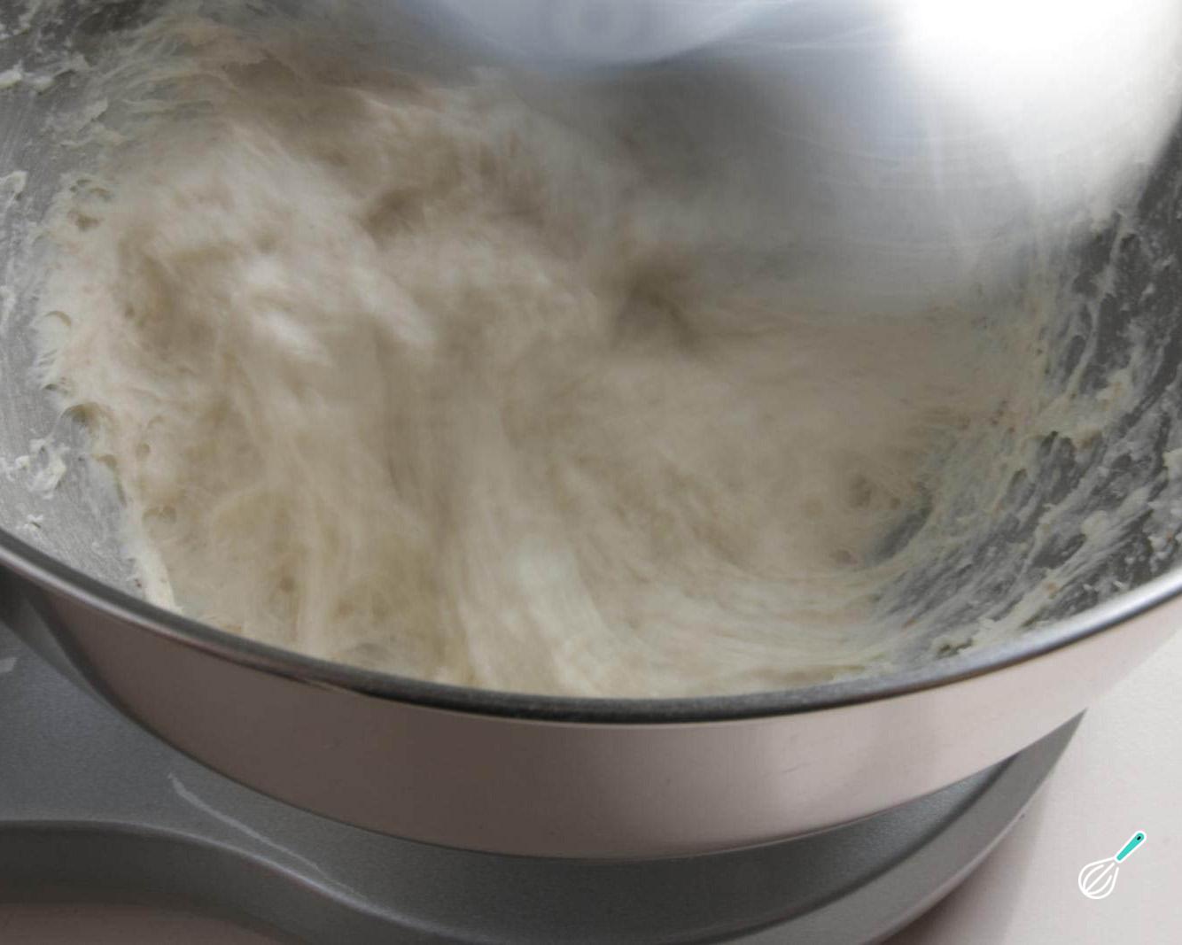 Polvilhe farinha numa bancada e coloque a massa nela. Adicione o sal e a manteiga e fique amassando e sovando até obter uma massa suave e consistente, com todos os ingredientes bem misturados nela. Cubra com um pano e deixe crescer por 20-30 minutos.