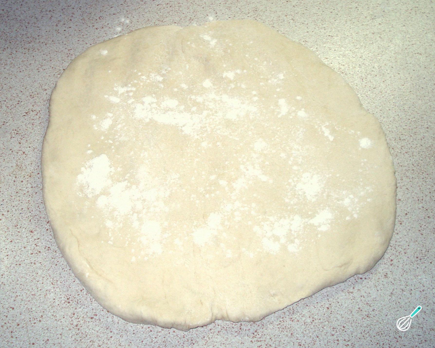 Depois do tempo indicado volte a amassar mas apenas um pouco, para retirar o ar. Divida a massa em duas metades iguais e abra as metades separadas com um rolo, para conseguir dois quadrados de massa de aproximadamente 40 x 40 cm.