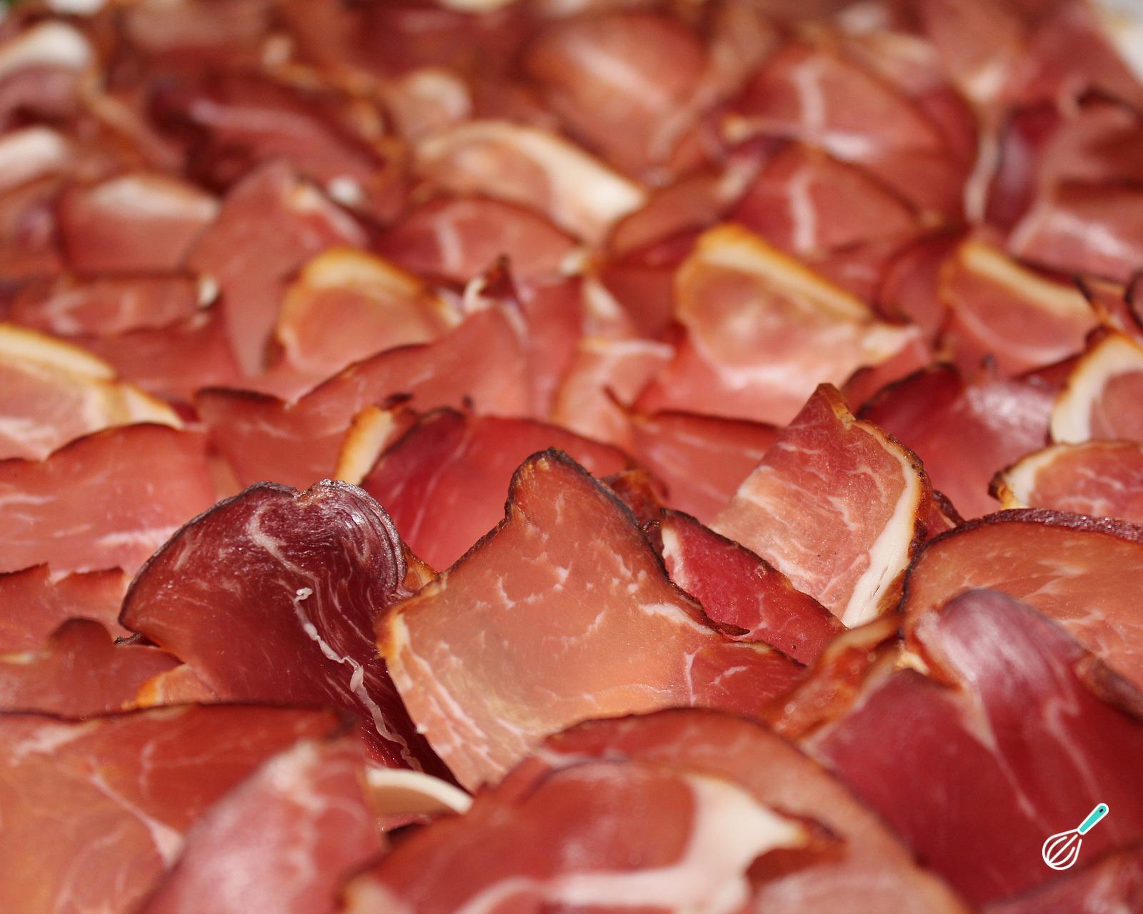 Sobre a massa coloque os ingredientes do recheio: primeiramente coloque uma camada de fatias de presunto, depois coloque uma camada de fatias de presunto e, por fim, polvilhe as azeitonas e a uva passa uniformemente.