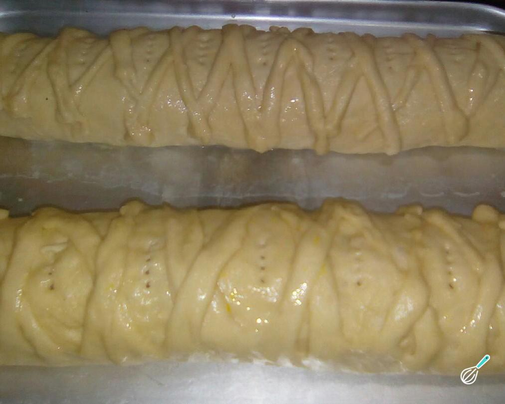 Coloque os pães recheados num tabuleiro de forno untado ou com papel manteiga, cubra novamente com um pano e deixe crescer por 45 minutos em um lugar morno. Ao fim desse tempo ligue o forno nos 180ºC e pincele os pães com um ovo batido.