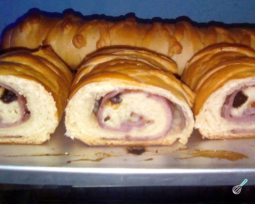 Está pronto seu pão caseiro recheado passo a passo com presunto, bacon, azeitonas e uva passa! Corte em fatias, sirva e diga nos comentários o que você achou. Bom apetite!