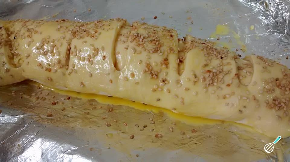 Estique a massa com um rolo da massa, coloque a mussarela, o catupiry e enrole a massa apertando bem, feche as pontas e pincele com gema e polvilhe com gergelim. Deixe descansar por mais 30 minutos para crescer.