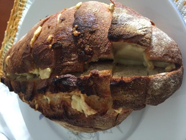 Com uma faca, corte uma grade no pão, como visto na imagem. Não alcance o fundo do pão com os cortes!