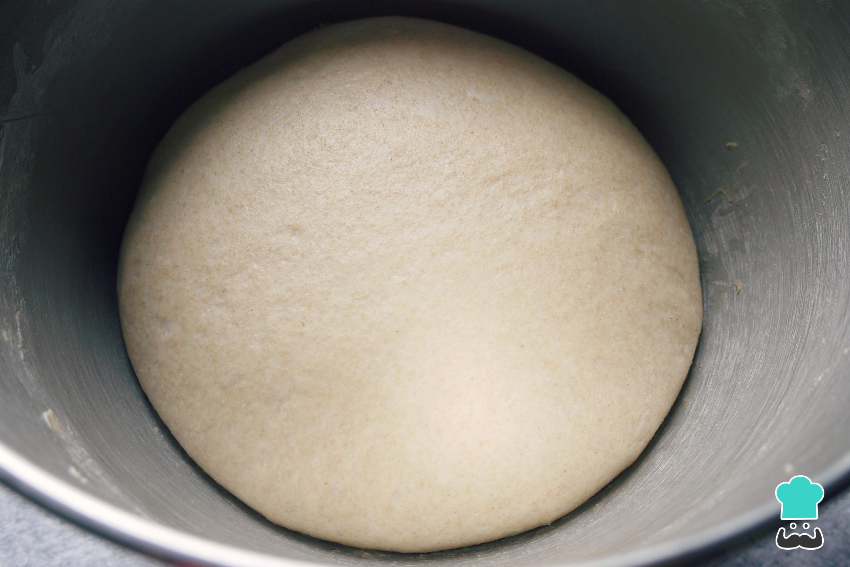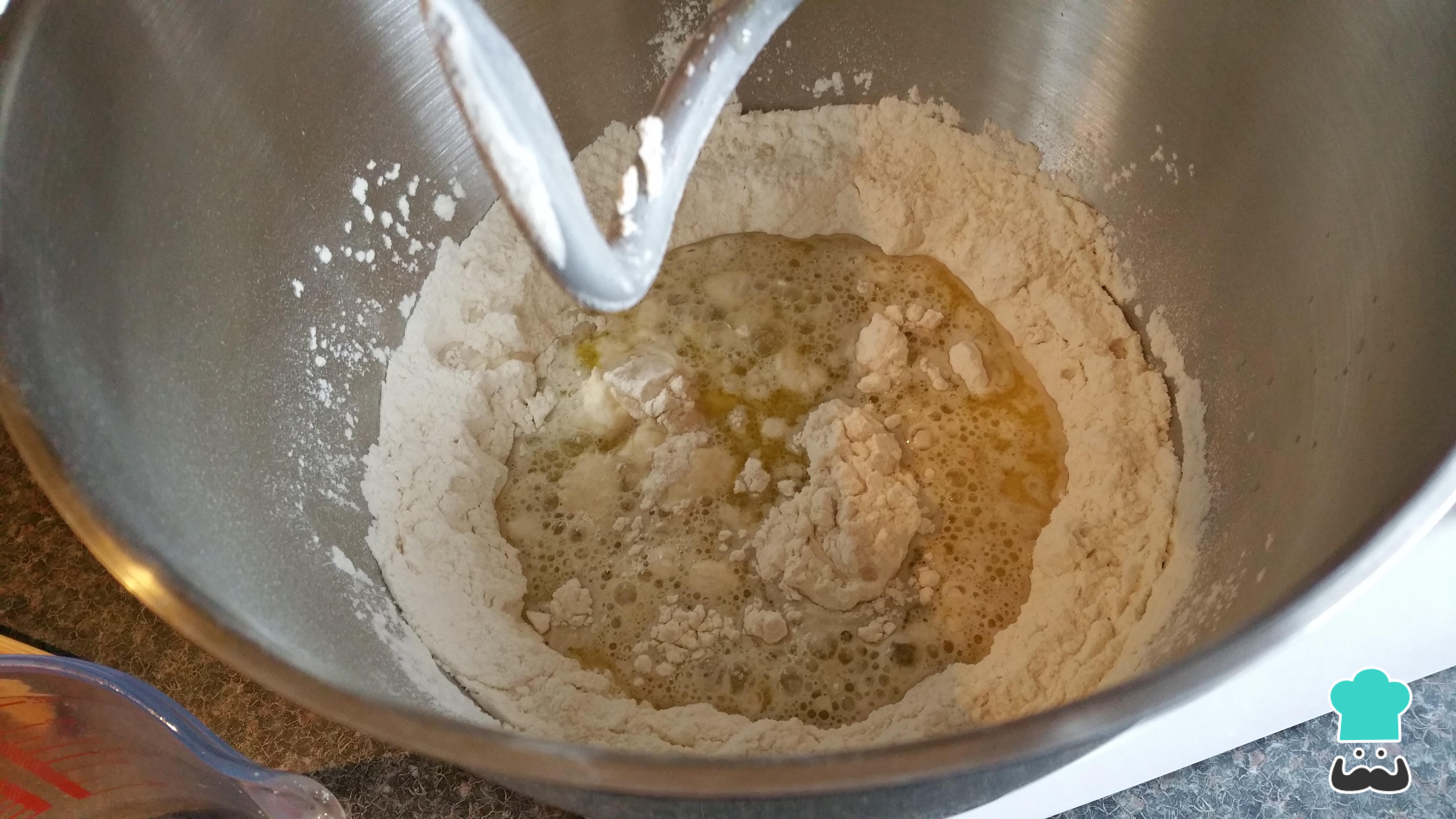 Misture os ingredientes líquidos com a farinha, misturando do centro para fora, em movimentos circulares. Quando a massa ficar pesada, sove numa superfície enfarinhada até ficar lisa e compacta. Modele em forma de bola e deixe descansar por 15 minutos.