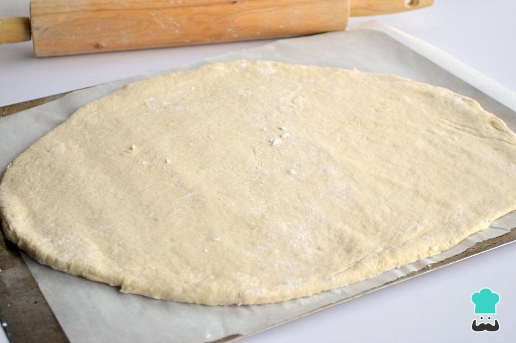 Depois do tempo indicado, continue preparando o pão segura marido: divida a massa em duas ou três partes, e abra cada uma com a ajuda de um rolo. Depois espalhe o molho de tomate e disponha as fatias de queijo e presunto.