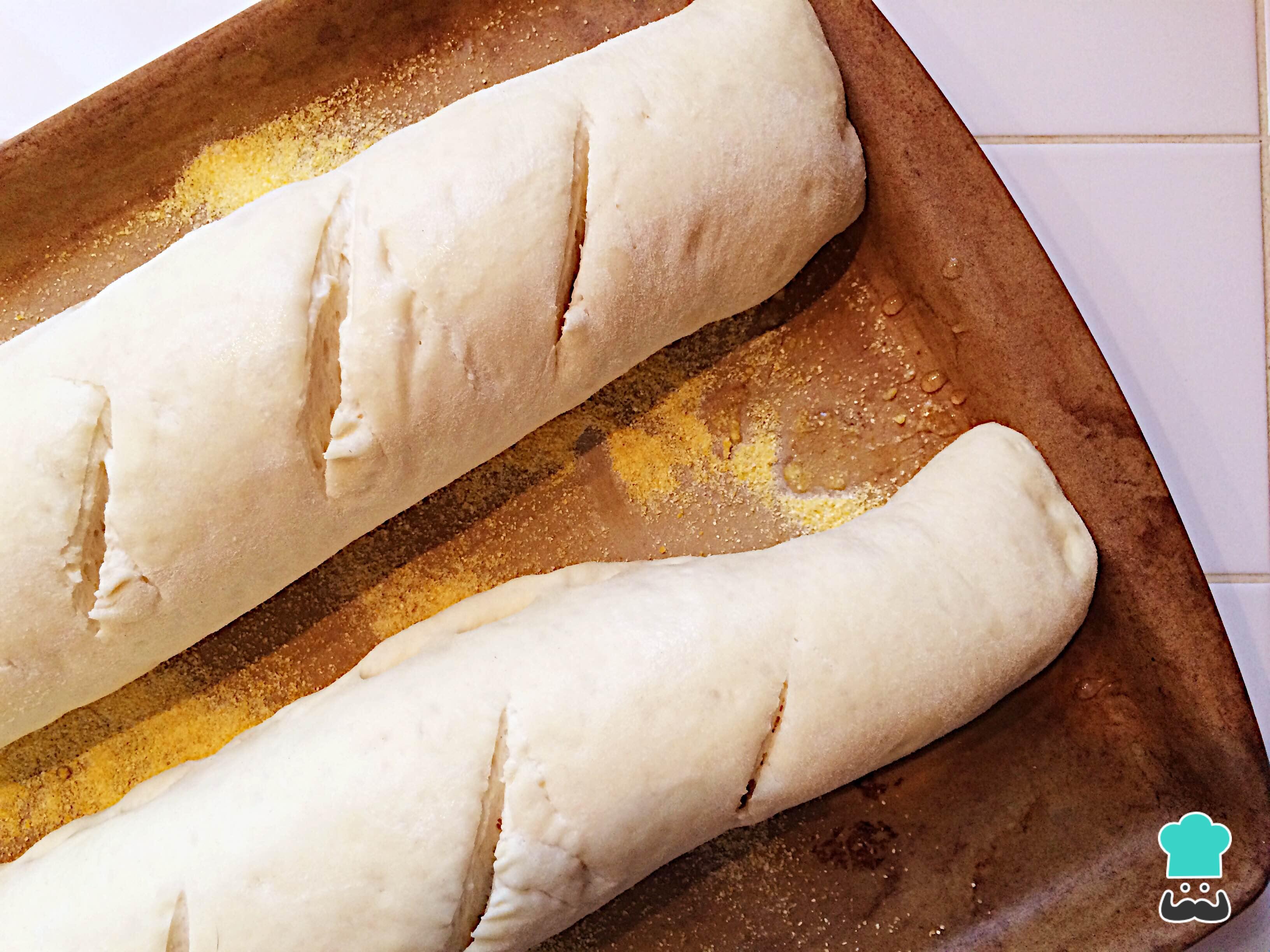Depois de rechear a massa, polvilhe oréganos e enrole como um rocambole. Faça dois ou três cortes na massa, para evitar que quebre, pincele com o ovo batido, e leve a assar no forno preaquecido a 180ºC por 20-30 minutos, ou até ficar dourada.