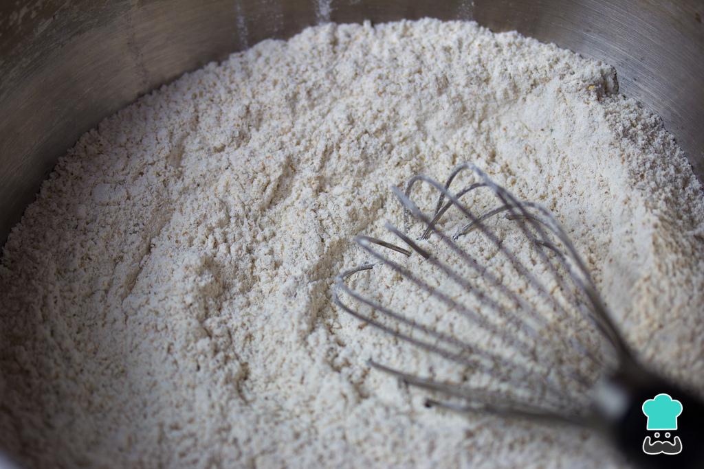 Para fazer esta receita de pão sem glúten o primeiro passo é misturar os ingredientes secos em uma tigela (a farinha, a fécula, o polvilho, o açúcar, o sal, o fermento e a goma).