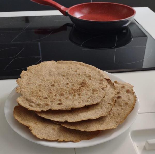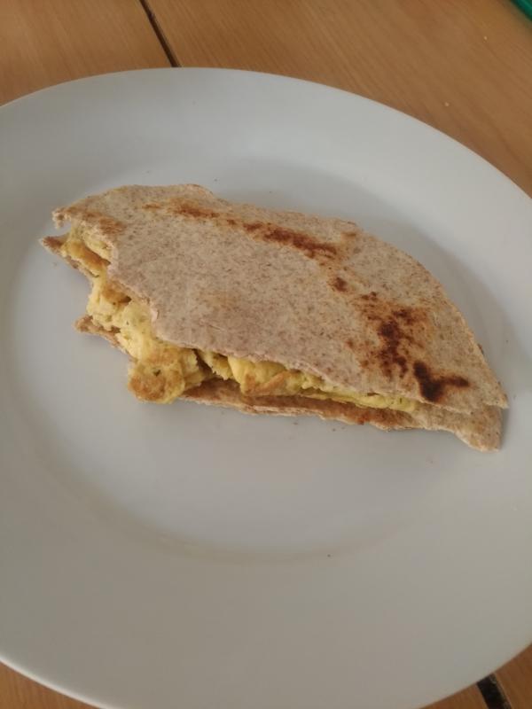 Acabei de fazer, usei um wok grosso. Ficou muito bom, ontem já tinha feito um pita com farinha branca e fermento seco, mas hoje já acabou. Como tinha feito coalhada seca para acompanhar, acabou sobrando, daí resolvi fazer essa receita com farinha integral, ficou muito gostoso!