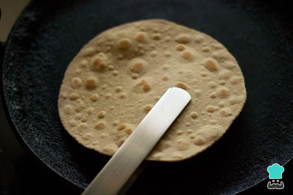 Separe a massa em várias bolinhas um pouco maiores que uma noz e abra com as mãos ou usando um rolo de cozinha. Leve ao fogo médio-alto uma frigideira grande sem gordura e coloque nela um dos discos de massa.