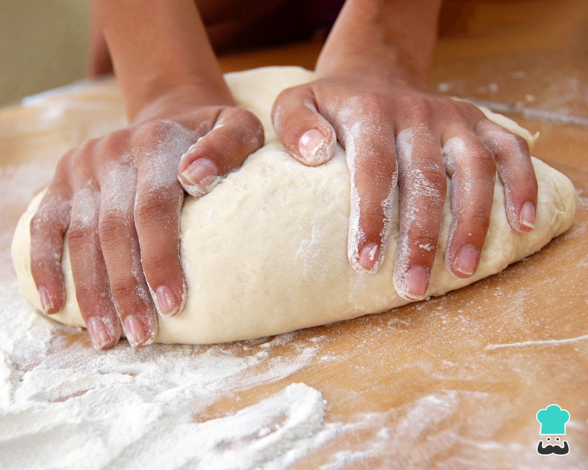 Retire a massa da tigela e amasse suavemente numa superfície limpa e polvilhada com farinha, dobrando a massa sobre si mesma e esticando-a com a palma da mão, por 1-2 minutos - isso ajuda a que a massa fique mais lisinha.