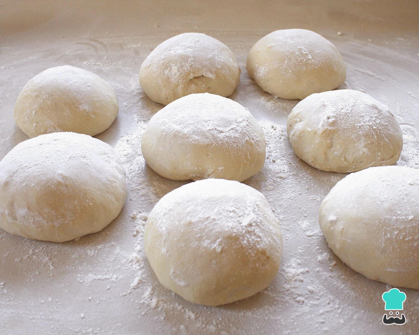 Após esse tempo separe a massa em 6-8 partes iguais, usando uma faca afiada ou uma espátula de massa. Modele esses pedaços em bolinhas e coloque num tabuleiro de forno ou assadeira forrada com papel manteiga, afastando bem umas das outras. Cubra com plástico filme ou com o mesmo pano usado anteriormente e deixe crescer por mais 30 minutos.