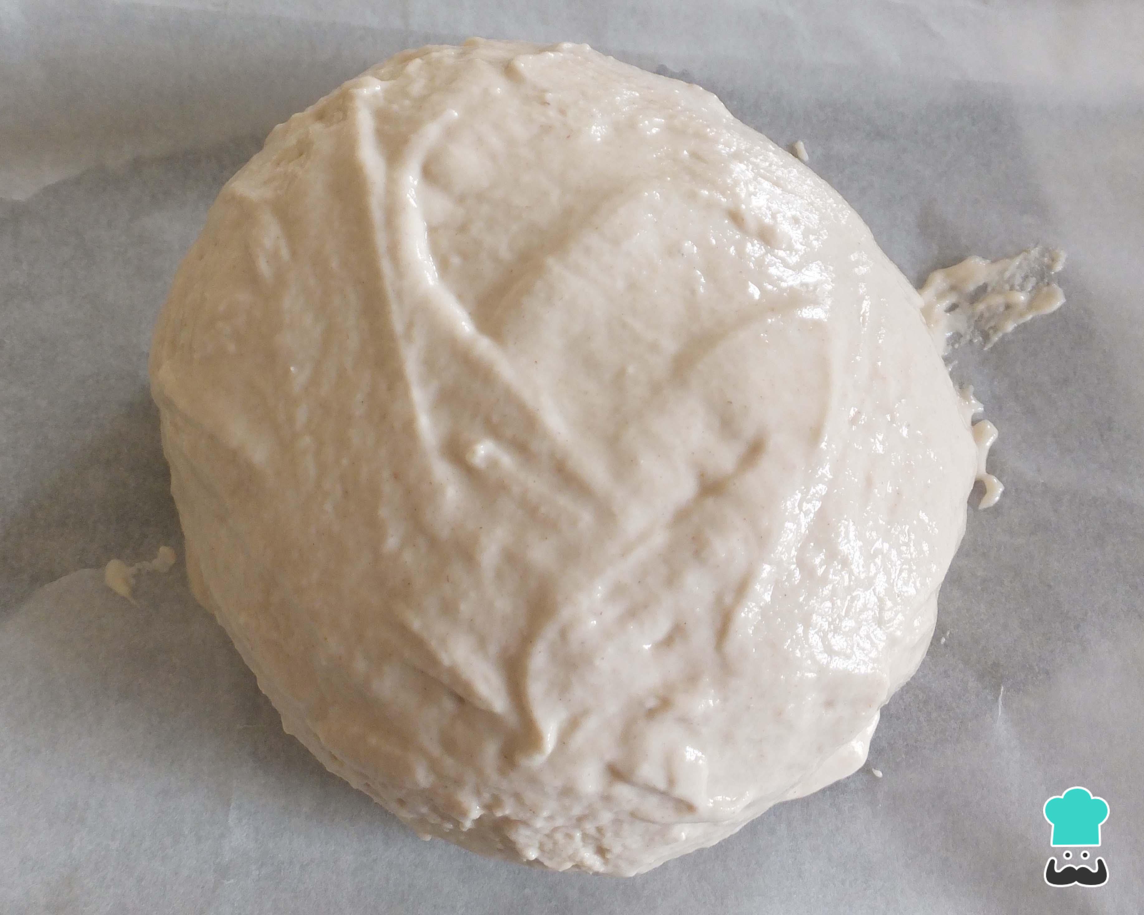 Enquanto isso, preaqueça o forno nos 200ºC (forno alto) e prepare a misturinha que está na origem do efeito craquelado desse pão! Coloque a farinha de arroz, a água, o açúcar, o óleo e o fermento numa tigela e misture até obter uma massa tipo mingau espesso. Reserve em um local quente ou morno.