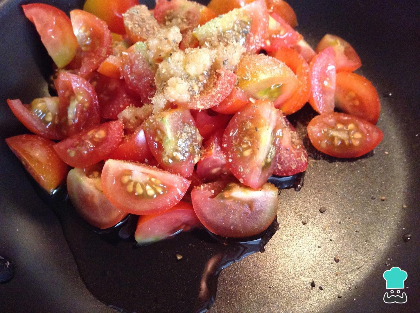 Leve uma frigideira com azeite de oliva a fogo médio e, quando esquentar, adicione o tomate cereja cortado em metades. Tempere com sal, pimenta-do-reino e um pouco de pasta de alho. Salteie bem a mistura.