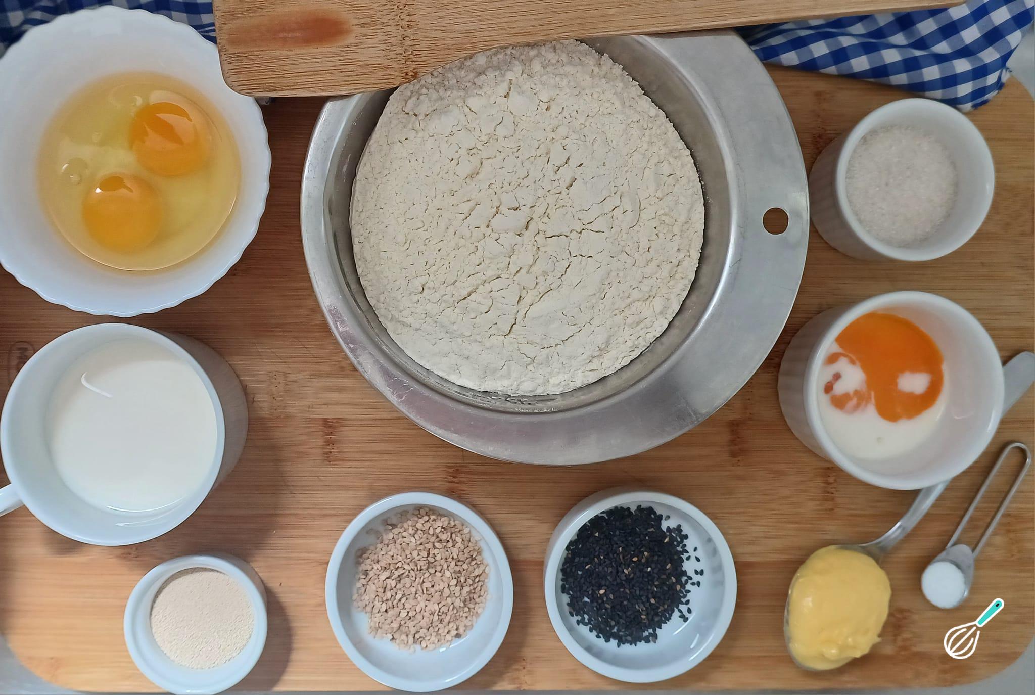 Separe todos os ingredientes necessários para preparar a recita de pão trançado.