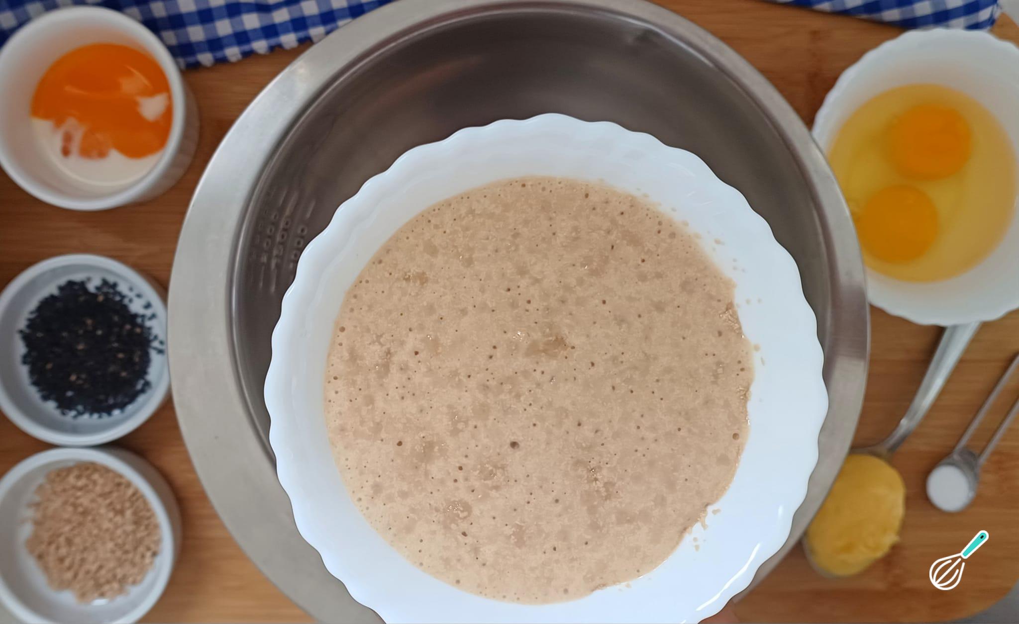Primeiro prepare o fermento, misturando-o com o leite morno e o açúcar, deixando-o descansar até começar a formar espuma.