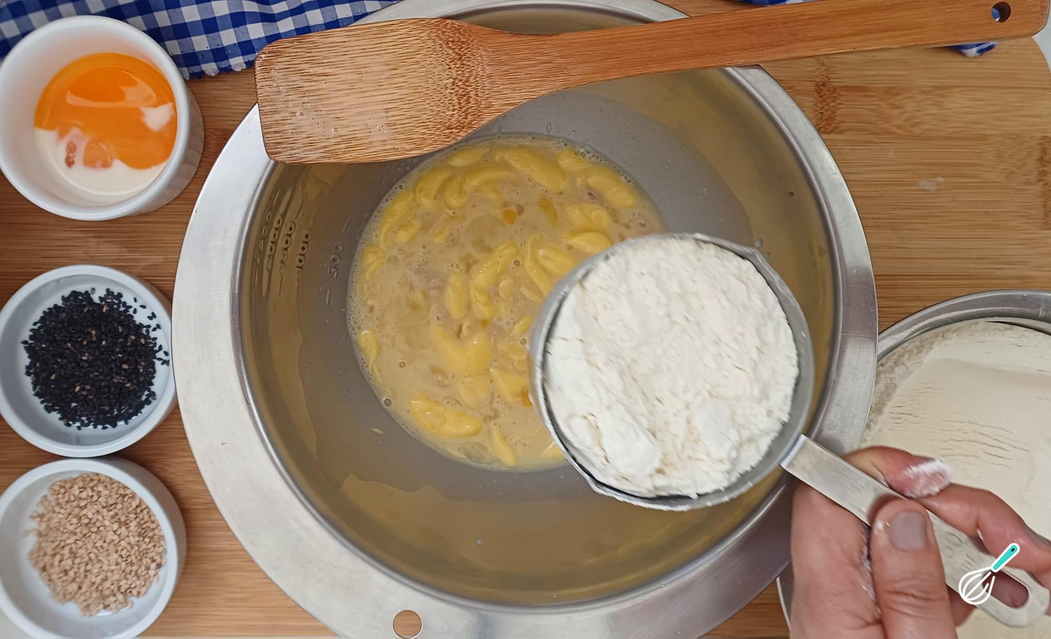 Num bowl grande, adicione a espuma do fermento, a manteiga, os ovos, o sal e vá adicionando a farinha de trigo aos poucos, misturando bem com uma colher firme.