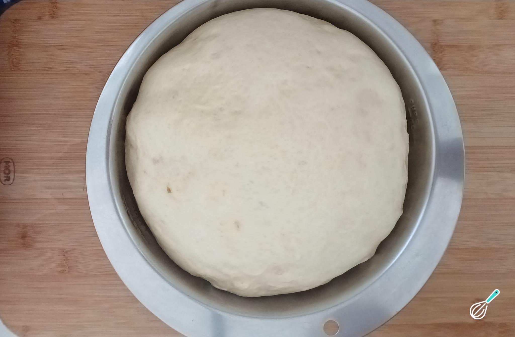 Após o tempo da sova, forme uma bola com a massa e acomode-a num bowl, cubra com um pano e deixe-a descansar por 1 hora ou até dobrar de volume, como mostra a foto abaixo.