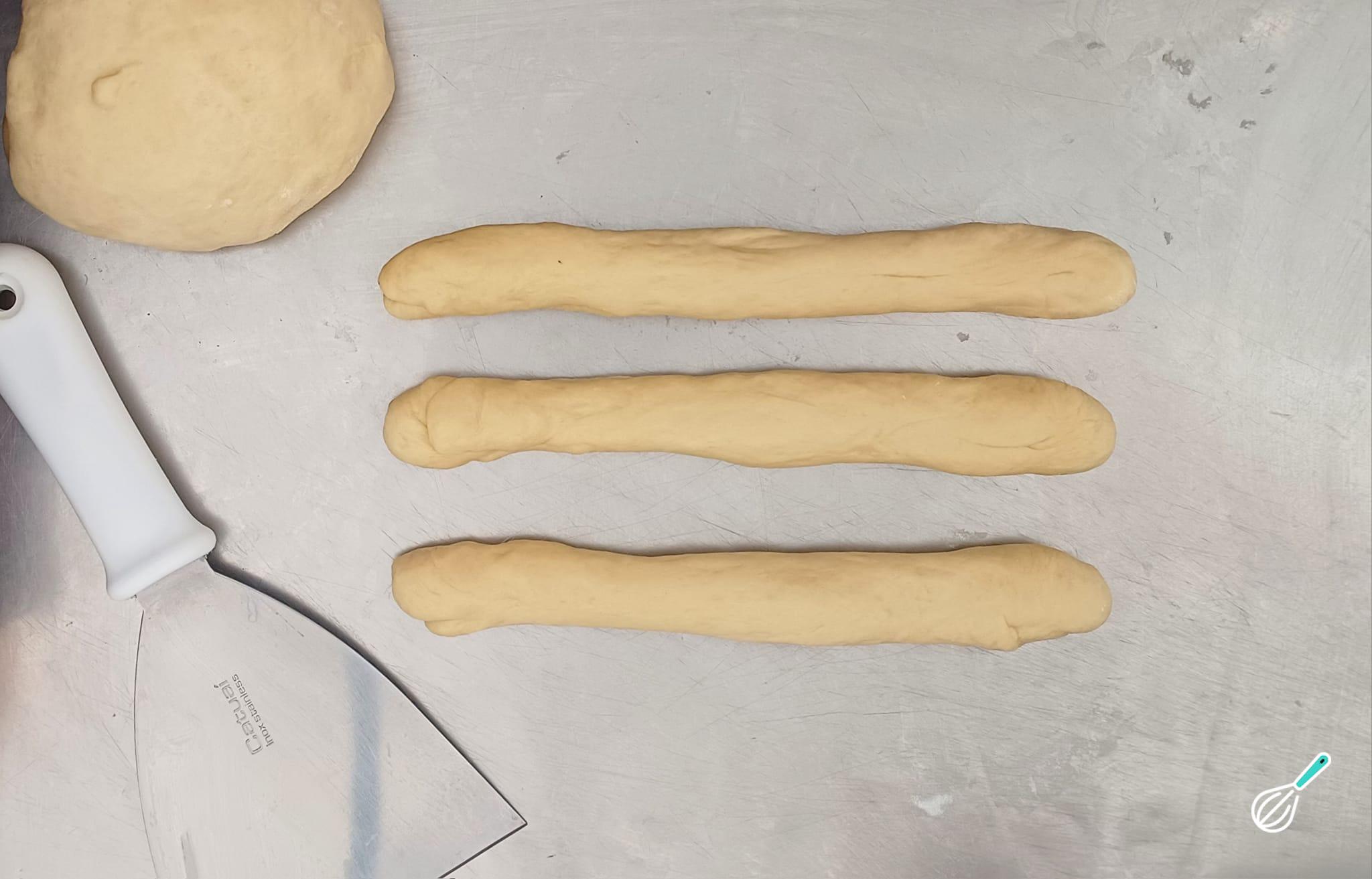 Divida a massa em 2 partes, separando 3 porções do mesmo tamanho com cada parte.
