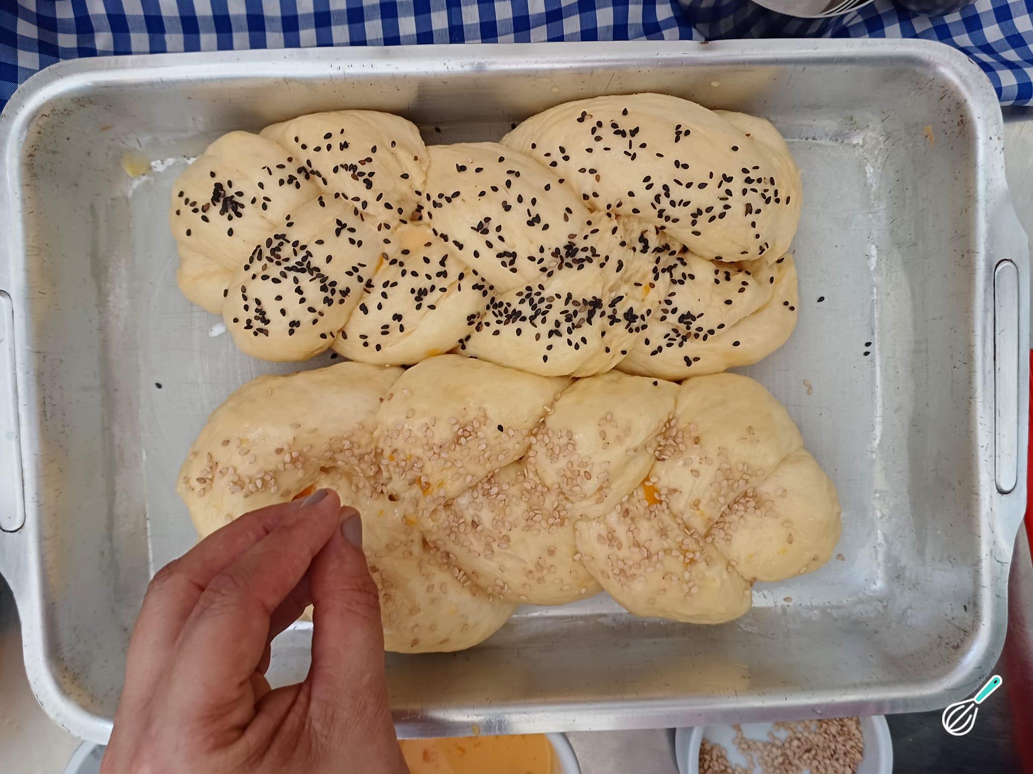 Depois que a massa crescer, pincele sobre elas uma mistura de gema de ovo com leite líquido e decore com gergelim.