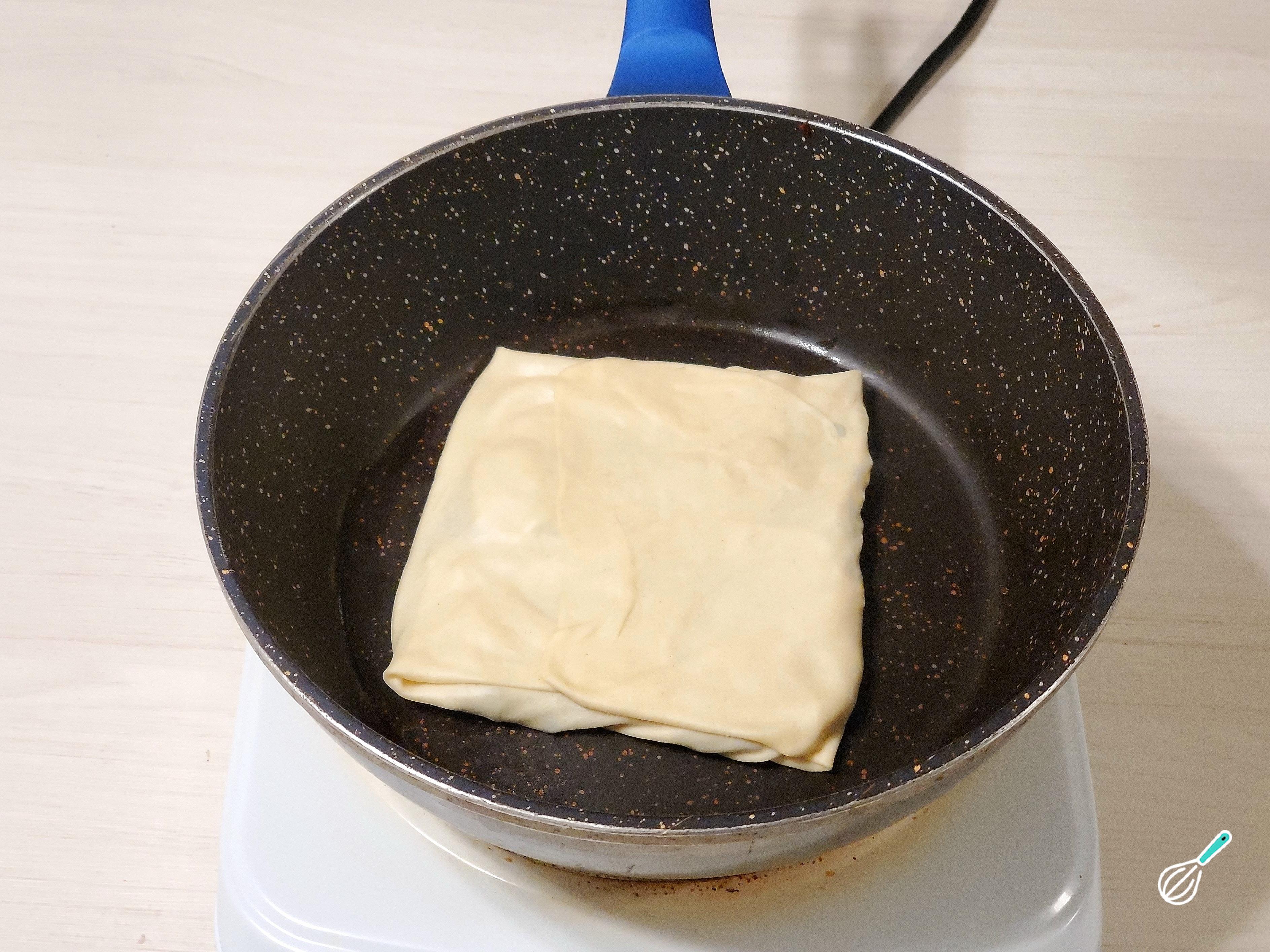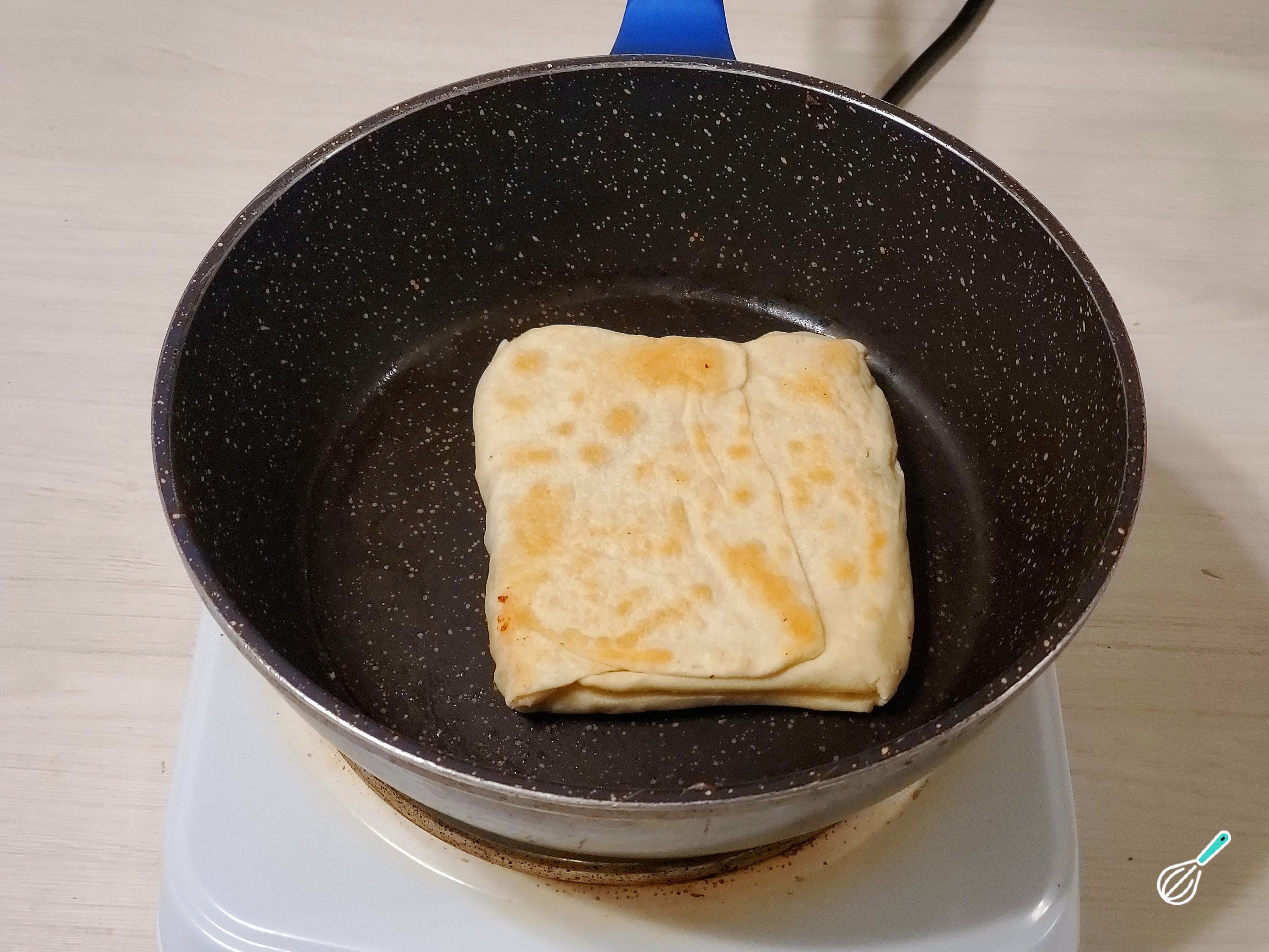 Para cozinhá-los, leve uma frigideira ao fogo médio-baixo , regue com um bom fio de azeite e espalhe bem. Coloque o seu pão turco - gözleme e cozinhe até dourar .