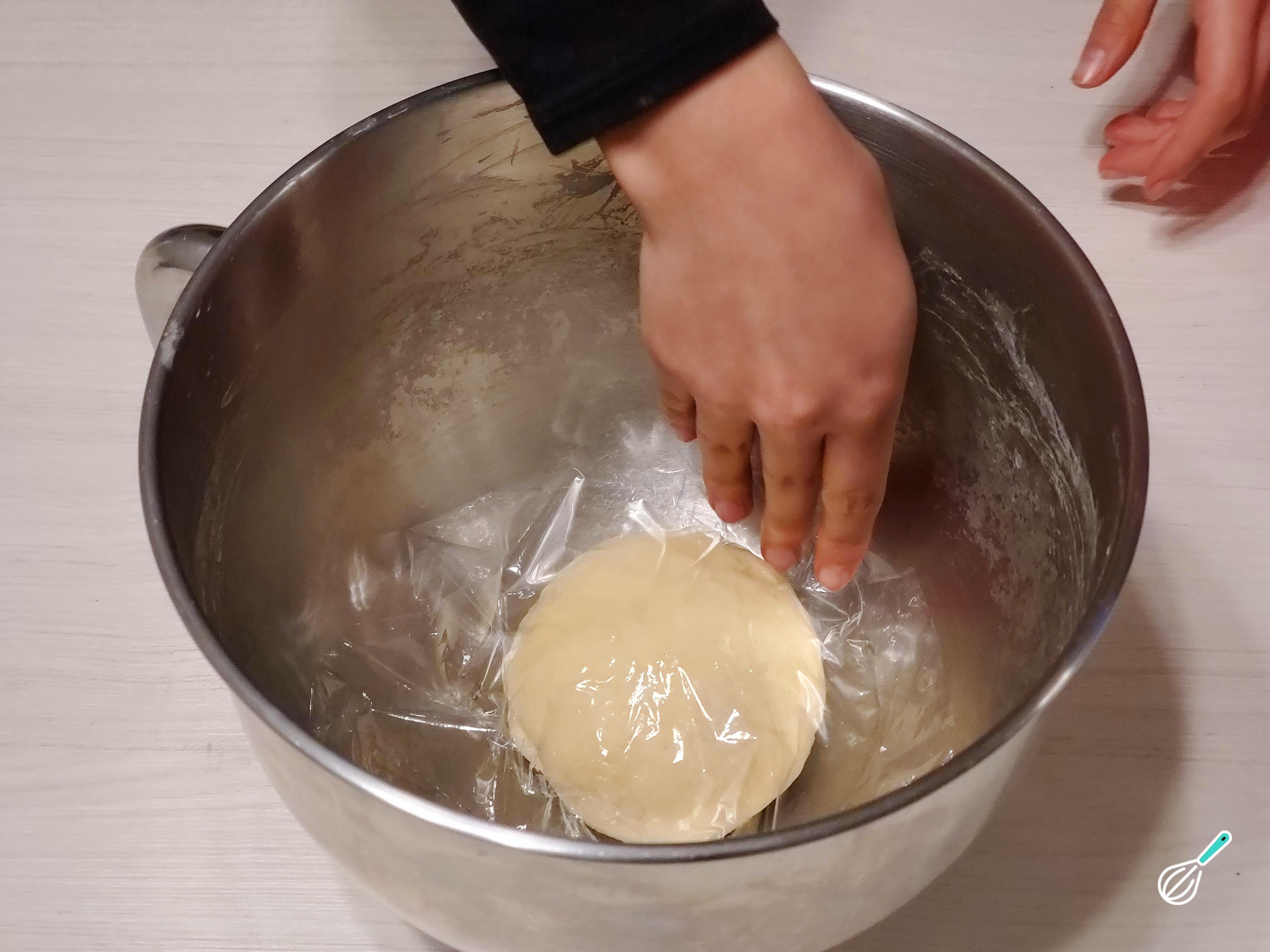 Faça uma bola compacta, espalhe o azeite por cima e deixe descansar por 1 hora para que o glúten que se formou durante o amassamento descanse. Cubra com filme plástico ou um pano de prato umedecido para evitar que se forme uma crosta na superfície e perca umidade.