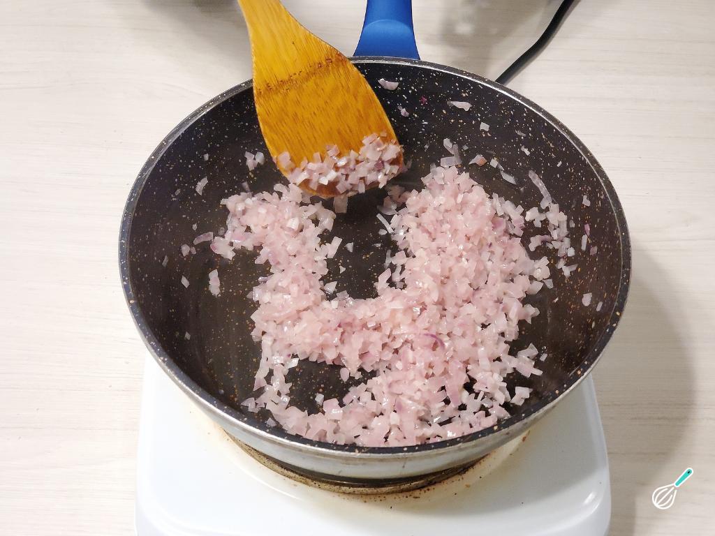 Durante o tempo de descanso da massa, faça o recheio. Comece fritando a cebola numa frigideira bem quente com um bom fio de azeite. Deixe suar e mexa esporadicamente para evitar que tome cor.
