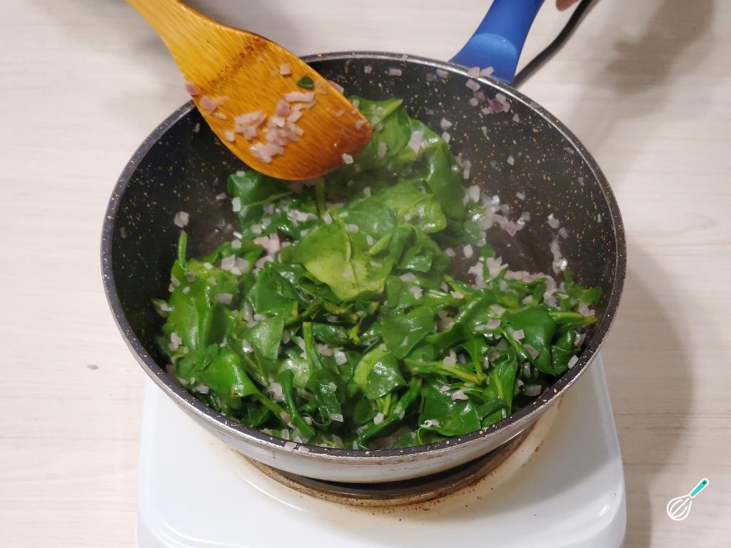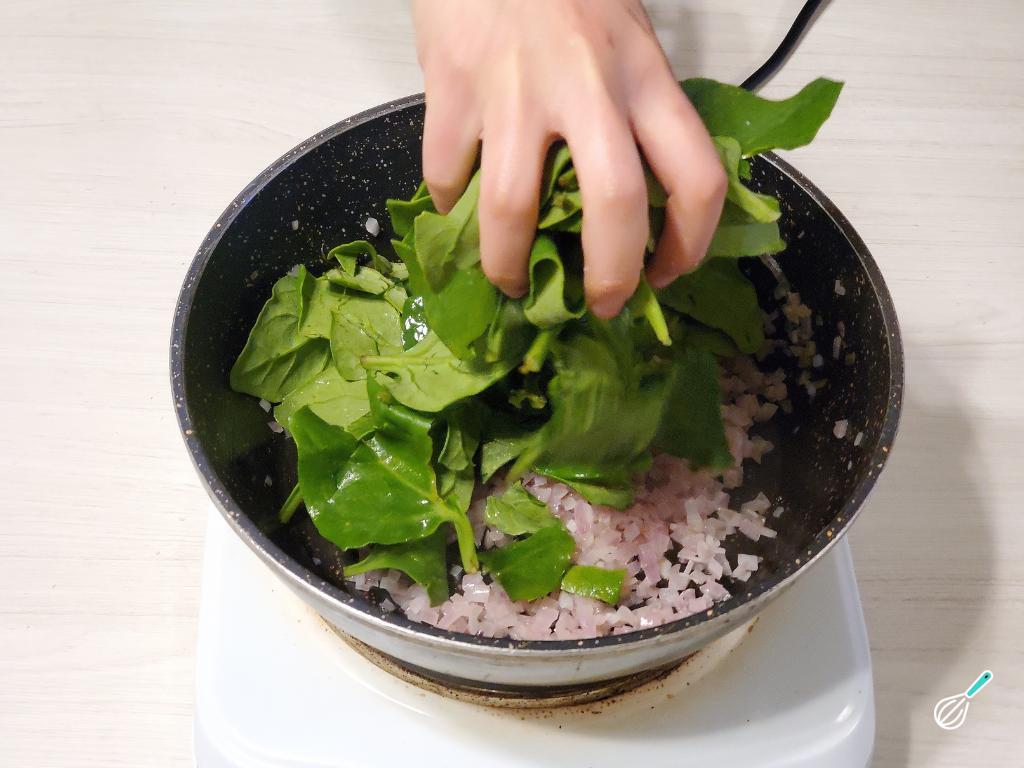 Quando a cebola estiver transparente, junte as folhas de espinafre previamente lavadas e secas. Refogue por alguns minutos até que reduzam o volume e adicione sal a gosto.