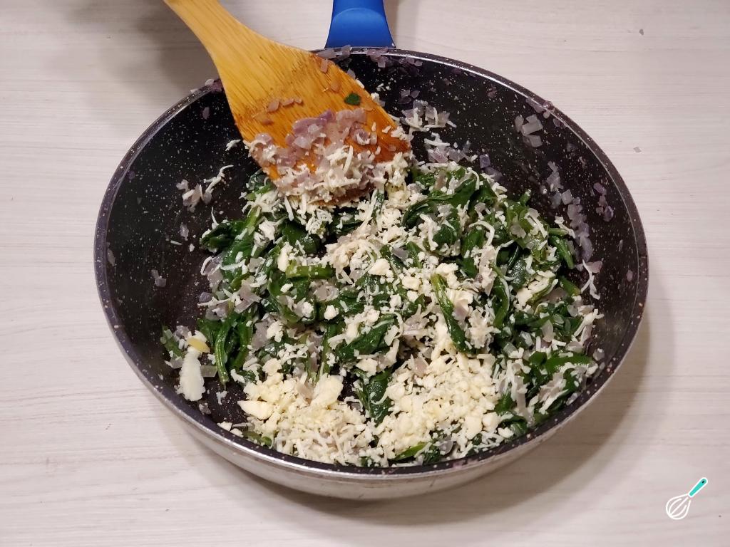 Em seguida, esfarele o queijo feta e incorpore-o à mistura de espinafre.